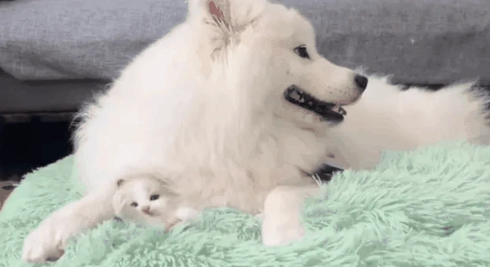 사이가 정말 좋아보이는 사모예드와 아깽이.gif