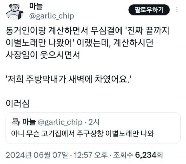 고깃집에서 이별 노래만 틀어준 이유 김밤비 0 273 0 5시간전 link URL 복사: https://joy.humorpick.com/bbs/board.php?bo_table=humor&wr_id=397419 0