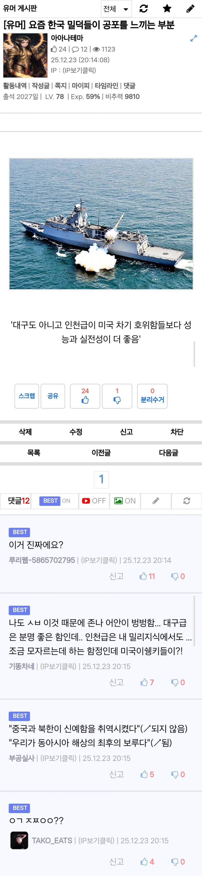 요즘 한국 밀덕들이 공포를 느끼는 부분 아기물티슈 0 202 0 5시간전 link URL 복사: https://joy.humorpick.com/bbs/board.php?bo_table=humor&wr_id=398092 Q. 저게 뭔소린데 ㅆㄷ아A. 미국 신형 군함 일부 상태가 영 메롱이라 카더라 0