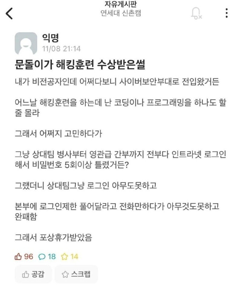 문돌이가 (군대) 해킹 훈련 수상 받은 썰.jpg Pixel 0 162 0 3시간전 link URL 복사: https://joy.humorpick.com/bbs/board.php?bo_table=humor&wr_id=399631 고무호스 암호분석(Rubber-hose cryptanalysis) 기법 0