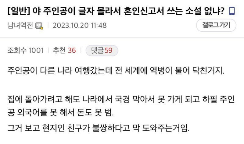 주인공이 글 몰라서 혼인신고하는 소설 김밤비 0 190 0 2시간전 link URL 복사: https://joy.humorpick.com/bbs/board.php?bo_table=humor&wr_id=400079 0