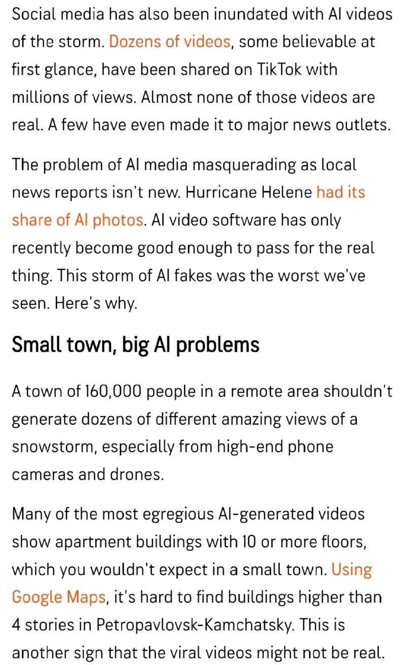 러시아 폭설이라고 돌아다니는 영상 대부분 AI임 아기물티슈 0 255 0 1시간전 link URL 복사: https://joy.humorpick.com/bbs/board.php?bo_table=humor&wr_id=400530 영어기사제목: 'Snow buries Russia's Kamchatka Peninsula, but don't believe the AI videos' 번역: '러시아 캄차카 반도가 눈으로 뒤덮였지만, 인공지능 영상은 믿지 마세요' 저 지방에 4층 이상 고층 빌딩 얼마 있지도 않고 실제론 최대로 많이 온 지역이 240cm 정도로 1층 채우는 수준 너 겨울 캄챠카 맛있탄다 0