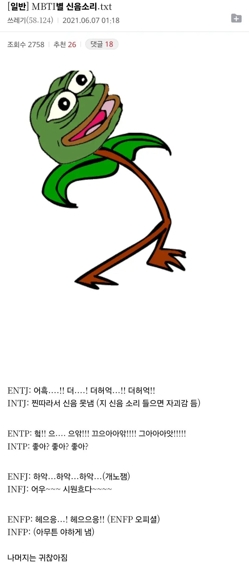 MBTI별 신음소리 아기물티슈 0 207 0 2시간전 link URL 복사: https://joy.humorpick.com/bbs/board.php?bo_table=humor&wr_id=400835 . 0