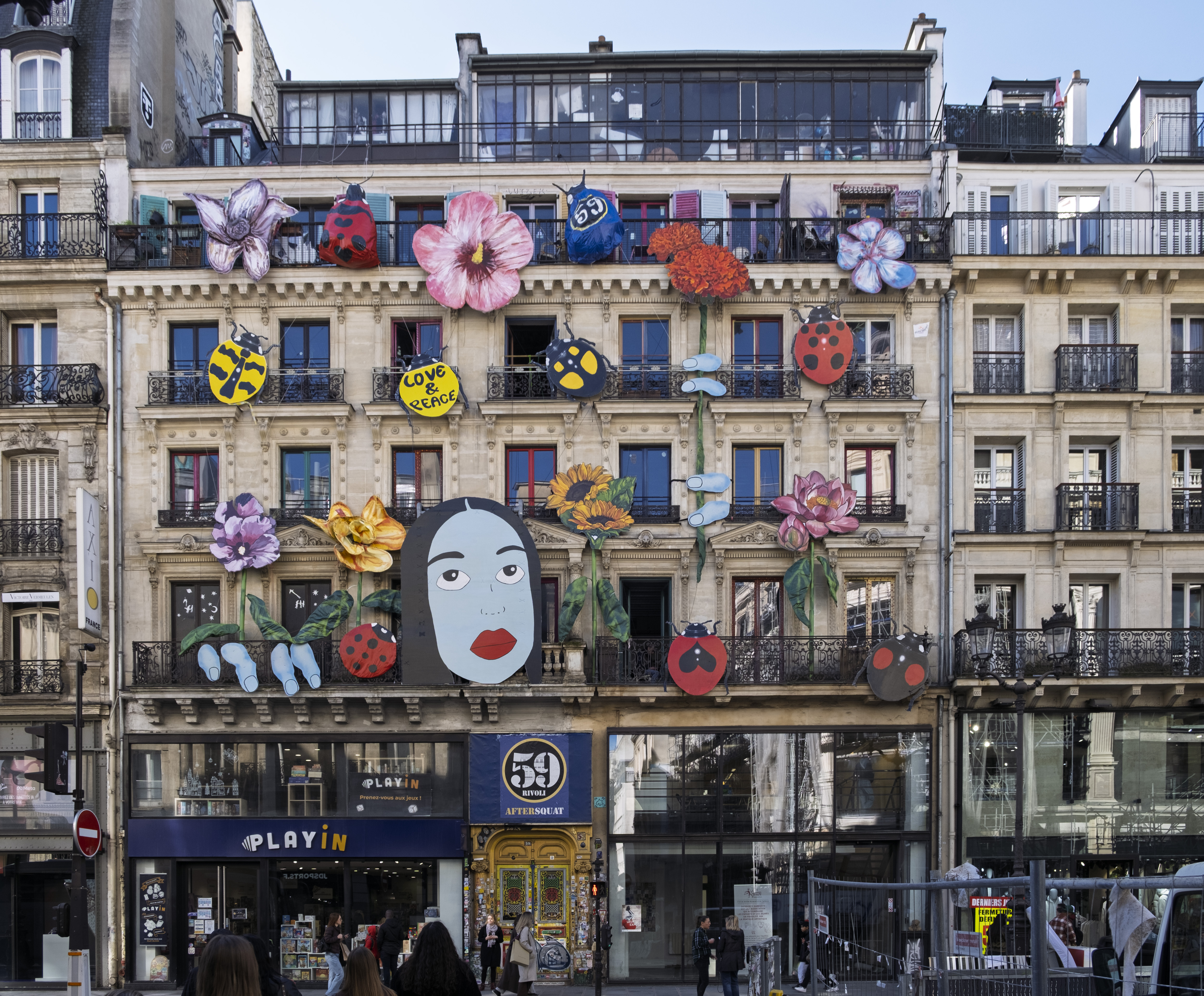 RIVOLI59 에서 파사드 라고 건물 외곽을 매년 다른 작가들이 맡아서 꾸미는 데 이번에 한국인 최초로 다른 두명의 아티스트(프랑스, 멕시코) 들과 함께 선정되어 디자인부터 제작 설치까지 거의 두달 꼬박 걸려서 얼마전에 설치 완료했어요. 저는 원래 무당벌레랑 손가락만 맡아서 하는건데 꼭 젤 잘 보이는 곳에 무궁화를 올리고 싶어서 며칠 밤새 가면서 열심히 만들었습니다.