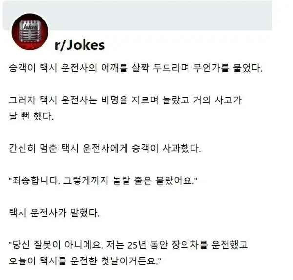 승객이 말을 걸어 놀란 택시 기사 버디버디 0 363 0 2시간전 link URL 복사: https://joy.humorpick.com/bbs/board.php?bo_table=humor&wr_id=405367 0