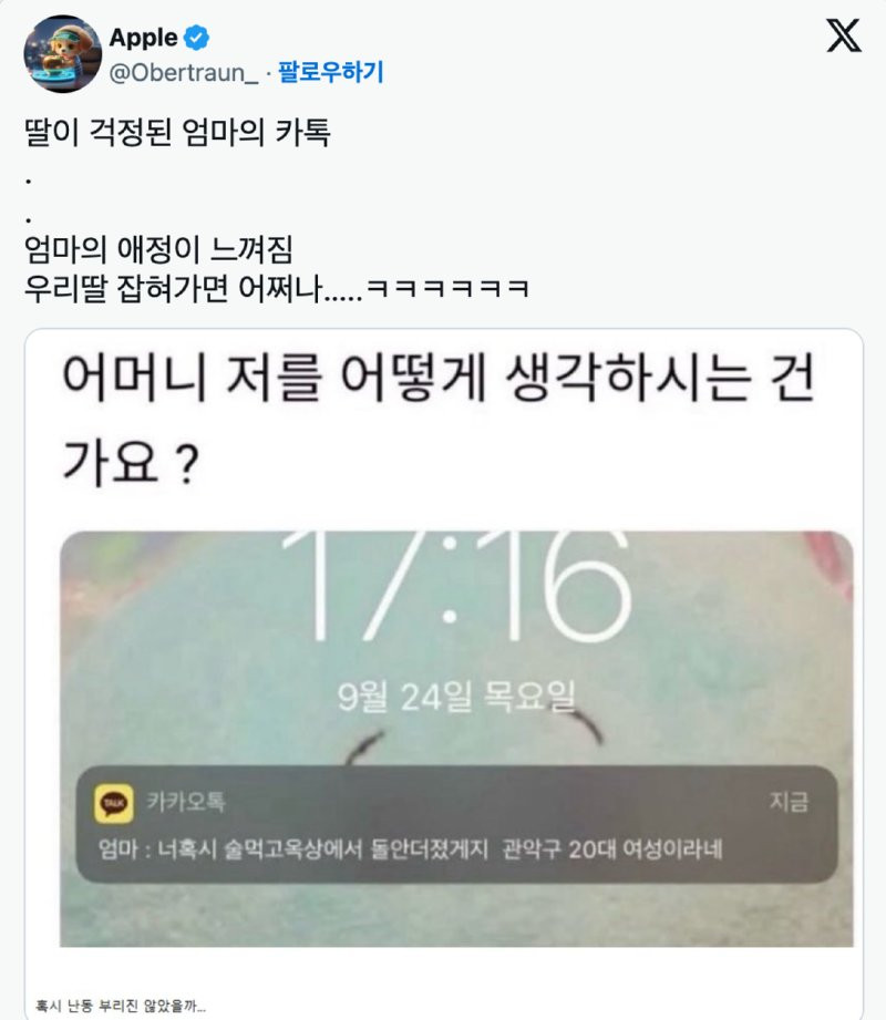 딸이 걱정 (의심)된 엄마의 카톡 푸른바다 0 302 0 2시간전 link URL 복사: https://joy.humorpick.com/bbs/board.php?bo_table=humor&wr_id=405672 너 혹시 술 먹고 옥상에서 돌 안 던졌겠지. 관악구 20대 여성이라네. 0