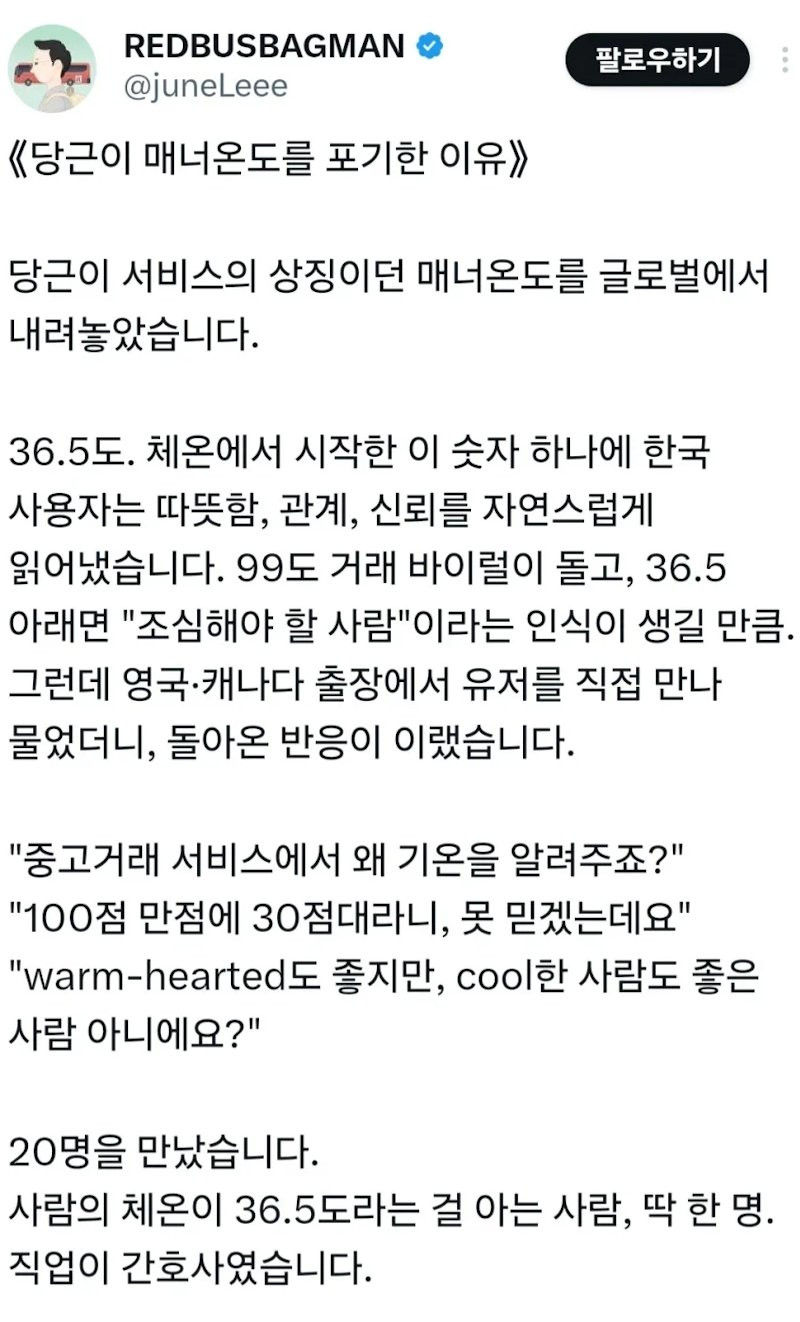 당근마켓이 해외에서 매너온도를 포기한 이유 Pixel 0 193 0 2시간전 link URL 복사: https://joy.humorpick.com/bbs/board.php?bo_table=humor&wr_id=405998 당근이 진출한 나라를 찾아보니 영국 2019년 / 캐나다 2020년 / 미국 2020년 / 일본 2021년 이긴 한데... 0