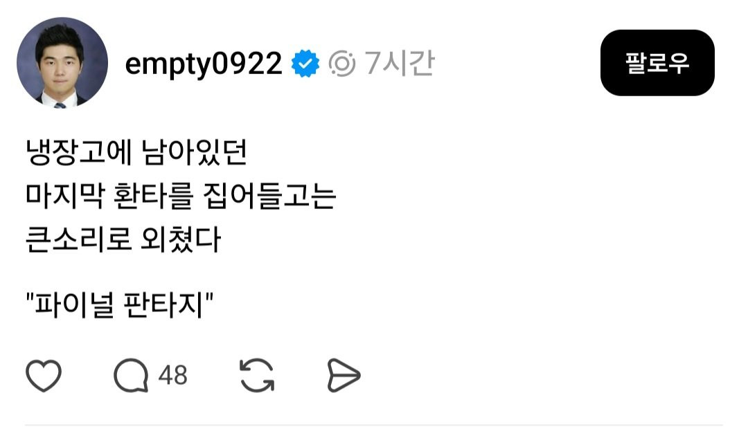 냉장고에 남은 마지막 환타를 집어들고 외친 말 아라셀리 0 231 0 1시간전 link URL 복사: https://joy.humorpick.com/bbs/board.php?bo_table=humor&wr_id=406162 ㅋㅋㅋㅋㅋㅋㅋㅋㅋㅋㅋㅋㅋ 0