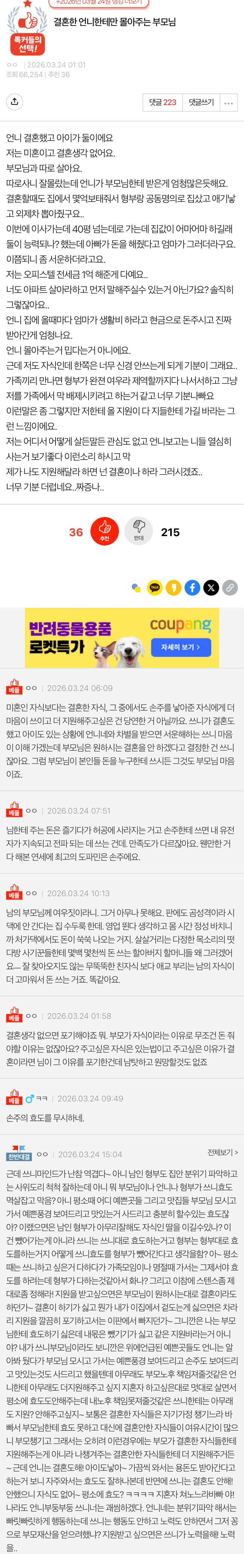 결혼한 언니한테만 몰아주는 부모님 아라셀리 0 177 0 5시간전 link URL 복사: https://joy.humorpick.com/bbs/board.php?bo_table=humor&wr_id=406435 0