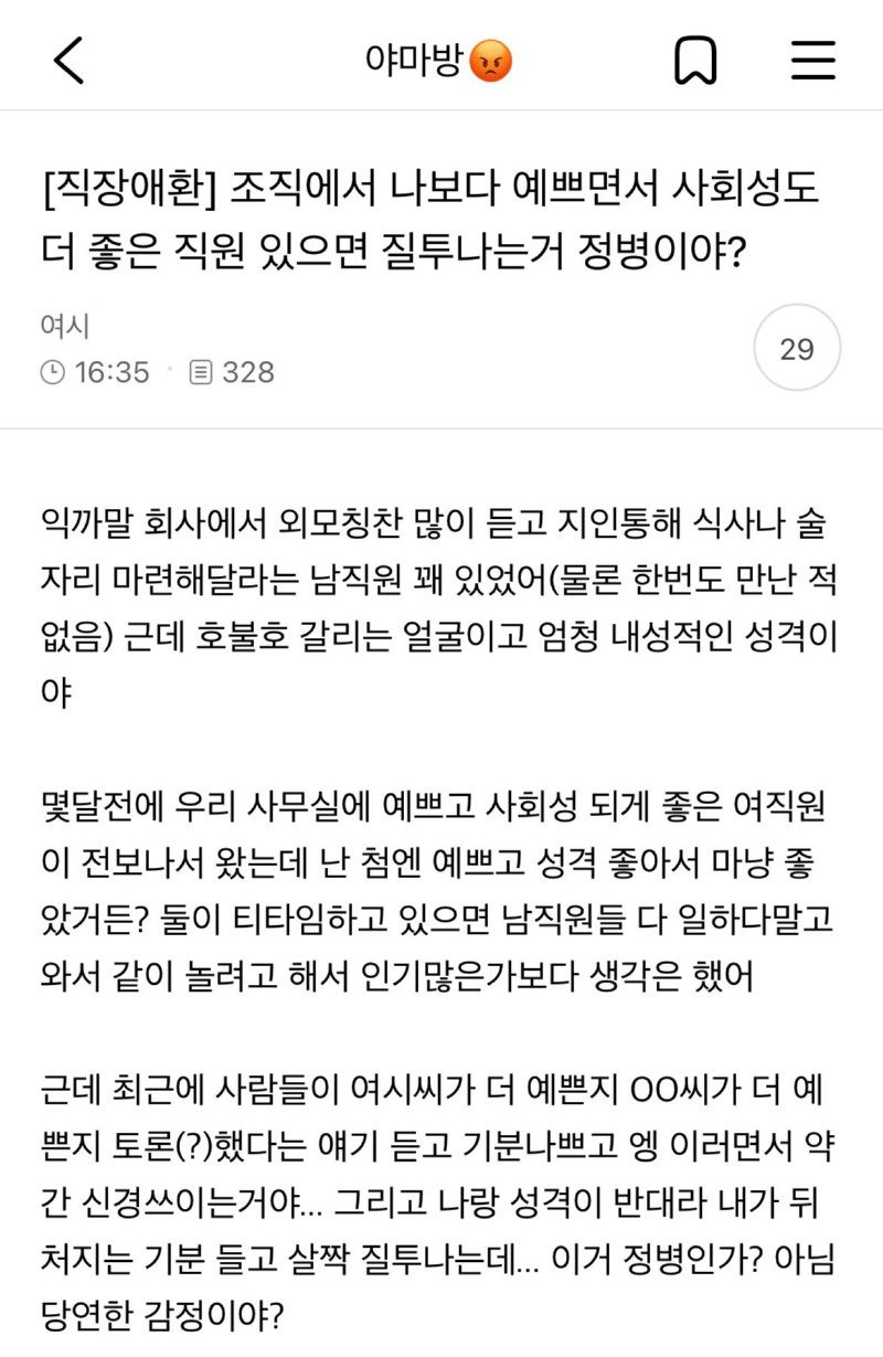 나보다 예쁘고 사회성도 좋은 직원 질투하면 정신병이야? 수민이에여 0 166 0 04.01 22:34 link URL 복사: https://joy.humorpick.com/bbs/board.php?bo_table=humor&wr_id=406723 0