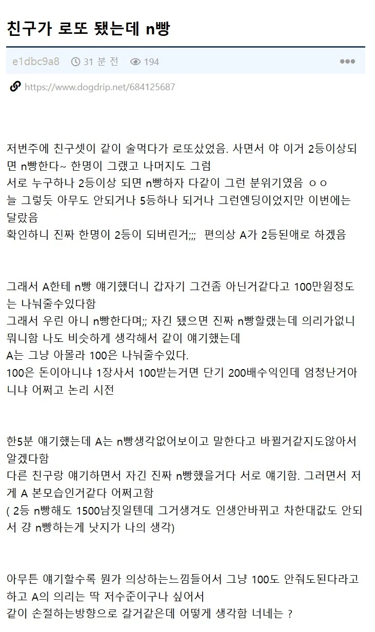 로또 당첨되면 N빵하기로 했는데 친구가 당첨됨 아기물티슈 0 284 0 1시간전 link URL 복사: https://joy.humorpick.com/bbs/board.php?bo_table=humor&wr_id=407803 근데 작성자 돈으로 사고 N빵하기로 이야기 된거면 N빵이 맞지 않나 0