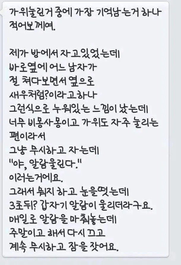 [소름주의] 가위 눌린 썰.jpg 라이츄 0 134 0 8시간전 link URL 복사: https://joy.humorpick.com/bbs/board.php?bo_table=ssul&wr_id=1337 너는 주댕이 털다가 맞아 뒤졌잖아.. 0