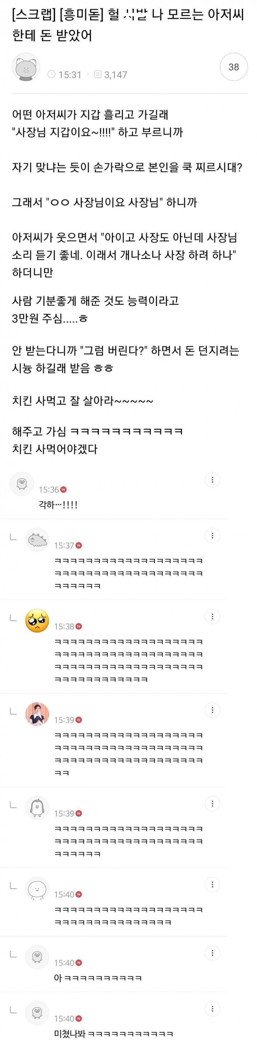모르는 아저씨한테 돈 받은 썰 아기물티슈 0 293 0 2시간전 link URL 복사: https://joy.humorpick.com/bbs/board.php?bo_table=ssul&wr_id=1435 0