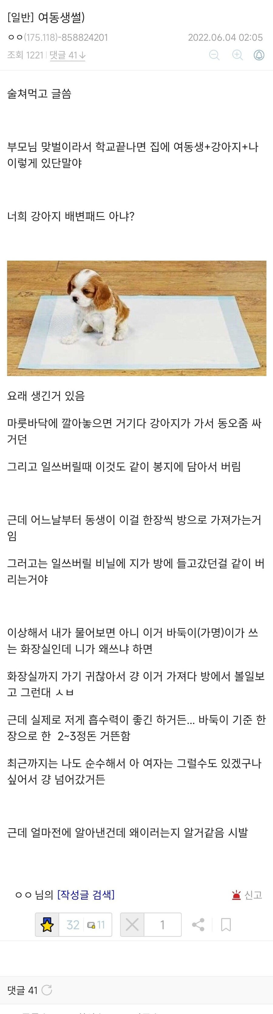 강아지 배변패드 쓰는 여동생썰 아기물티슈 0 195 0 2시간전 link URL 복사: https://joy.humorpick.com/bbs/board.php?bo_table=ssul&wr_id=1604 여동생의 해피타임 0