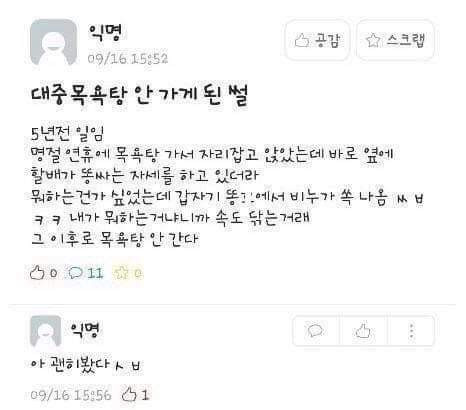 펌)) 대중목용탕 안가게된썰... 아기물티슈 0 310 0 2시간전 link URL 복사: https://joy.humorpick.com/bbs/board.php?bo_table=ssul&wr_id=1649 0