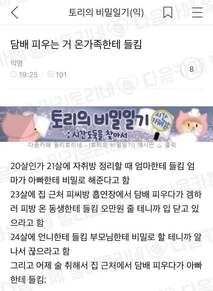 담배 피우는 거 온 가족에게 들킨 썰. 버디버디 0 254 0 4시간전 link URL 복사: https://joy.humorpick.com/bbs/board.php?bo_table=ssul&wr_id=1851 0